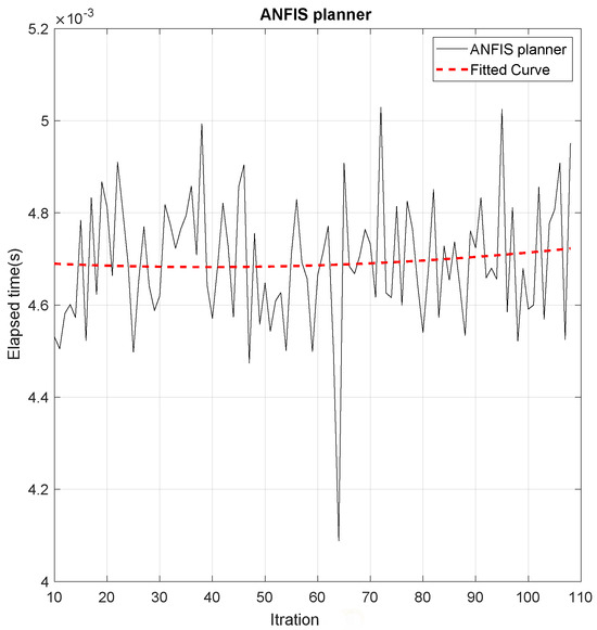 Computational time required by the ANFIS planner in each iteration during the experiment. The red dashed line represent fitted curve shows the second order regression to illustrate a simplified representation of the data.