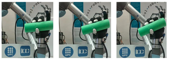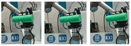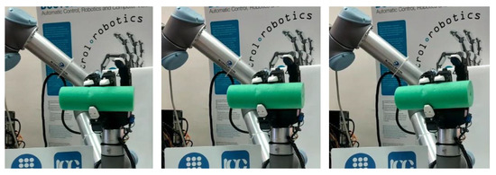 Figure 14, Figure 15 and Figure 16 show images of the experiment in the real setup for rotation of the unkhown object around the X-, Y-, and Z-axes, respectively. A video of the experiment is available at youtube.com/IOC Robotics Lab (accessed on 21 May 2024). It is worth noting that, due to the kinematic structure of the hand, depending on the hand configuration, certain motions have a more limited range than others. This is what happens to the rotation of an unknown object around the Z-axis in comparison to the other axes, creating the appearance of slower movements.