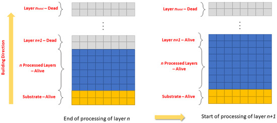 The common mesh strategy technique of the conventional FE modeling of the L-PBF process utilizes a cuboid mesh discretization of the powder bed and the region that contains the AM part. The ‘element birth and death’ technique is usually employed in order to keep the system stiffness matrix small at the beginning of the process, increasing it step-wise, together with the successive addition of the layers. Practically, this means that all the elements of the cuboid discretized part are initially in ‘dead’ status, which means that they do not contribute to the stiffness matrices of the elements. As the process evolves and layers are added, the corresponding elements are turned to status ‘alive’, meaning that the elements that discretize the respective layers are activated and begin to contribute to the stiffness matrix. The schematic description of the ‘element birth and death’ technique is presented in