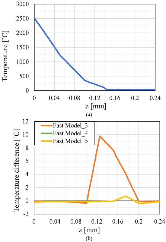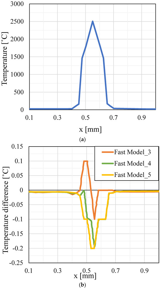 Three parametric variations in the adaptive mesh refinement modeling approach are tested, based on the number of dense layers used to simulate the nonlinear phenomena around the melt pool. This parametric analysis is performed to determine the necessary number of dense layers above the coarse layers for an accurate analysis. The three model variations contained 3, 4, and 5 dense meshed layers underneath the processed layer. These models are referred to as Fast Model-3, Fast Model-4, and Fast Model-5, respectively. As already mentioned, in the FE model based on the adaptive mesh refinement approach the geometry is not defined from the beginning of the simulation; when the processing of a layer finishes, a new layer is added to the model. The size of the elements of the fine mesh and coarse mesh are 0.25 mm and 0.50 mm, respectively. This strategy is based on the fact that the top layers are those influenced the most by the heat input by the beam, characterized by a high degree of non-linearity, while the effect of the beam decreases as we move toward the bottom layer and the heat transfer phenomena become more linear. The melt pool is also limited to a few layers below the top layer. Since the fine and the coarse mesh have different densities, they should be joined at their interface. Eight-node hexahedral solid elements (SOLID70) are used for the discretization of the unit cell and the substrate. The joining of the two meshes is performed using contact elements. Node-to-surface contact pairs, consisting of CONTACT175 and TARGET170 elements, are used to join the two meshes. With the use of the contact pair, each node of the fine mesh is now connected with the element of the coarse mesh located below. An important parameter in a contact pair is the conductivity of the contact. In our case, the contact conductivity was selected to be equal to the conductivity of the powder. This approach is followed because most of the contact regions are in a powder state. In addition, testing was conducted using the conductivity of the solid material as the conductivity of the contact and no differences were observed in the results. It should be stated, however, that generally increased attention should be given to the contact conductivity considering the specific model geometry and the nature of the contact under investigation. As the process evolves and the subsequent layers are added to the part, the new layers enter the model with a high-density mesh and the previous mesh for the bottom layers is updated to the low density.