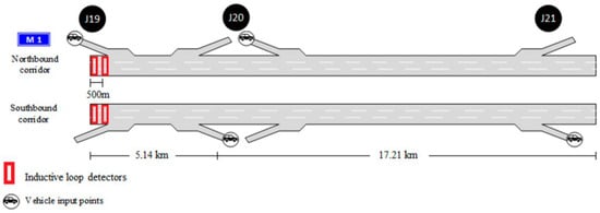 The real-world mainline corridor of the M1 motorway as well as all the on and off-ramps were equipped with inductive loop detectors approximately every 500 metres. Each set of detectors provided traffic data such as speed, headway, traffic volume, occupancy, and composition for each lane at 1-min intervals [40].