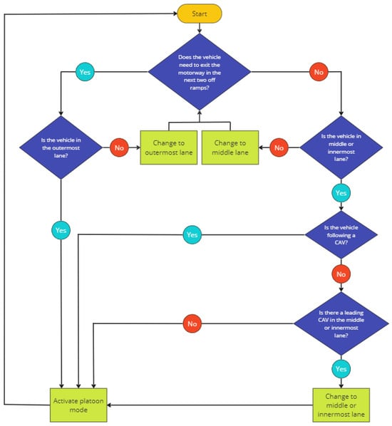 In the developed API, CAVs are programmed to follow a high-level route choice decision-making algorithm. The flowchart of this route choice algorithm is presented in Figure 2. In the route-based decision-making algorithm, a CAV first dynamically selects lanes according to their path planning algorithms, optimising traffic flow and safety. For example, if the destination of the API-controlled vehicle is one of the two upcoming off-ramps on the motorway, the CAV chooses to drive in the outermost lane of the motorway to facilitate a smooth exit. This decision-making process ensures that vehicles intending to exit can do so efficiently without causing disruptions in the inner lanes.