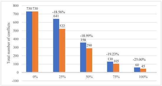 Total number of conflict reduction due to the route-based decision-making algorithm.