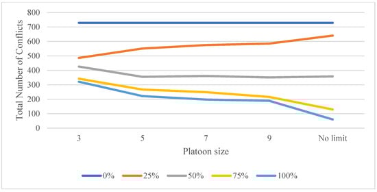 The results regarding the safety impacts of platoon size for all the predefined market penetration rates are presented in Figure 4. If the market penetration rate is examined alone, it is obvious that CAVs provide a significant benefit in terms of reducing the number of simulated conflicts. However, when examining the impact of platoon size within the same market penetration rate, the results provide an interesting insight.