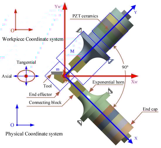 Due to the minimal mutual interference and the highest decoupling efficiency when the angle between two sets of vibrating waves in two-dimensional space is 90° [30], the two branches of the D-UEVC device considered in this study are arranged with a 90° angular layout, as shown in Figure 1. The ultrasonic vibrating waves generated by four pieces of PZT are delivered by an exponential amplitude horn. An elliptical trajectory occurs at the end effector when the ultrasonic vibration of the two branches is transmitted to the end effector [31].