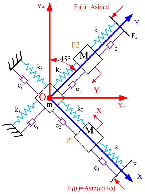 Based on the considerations above, an equivalent two-degree-of-freedom vibration system model is constructed, as depicted in Figure 2. In this model, points F1, F2 represent the initial vibration positions in the fixed node plane; P1 and P2 are the output points at the ends of the ultrasonic amplitude horns; and O is the vibration output point of the end actuator. The equivalent stiffness k1 and equivalent damping c1 correspond to the properties of the structural connecting column; k2 and c2 represent the equivalent stiffness and damping of the chamfered straight-beam flexible hinge. The equivalent stiffness kL and damping cL represent the load stiffness and damping of the single branch in the X and Y directions, respectively. The mass m is equal to the total mass of the end effector; the mass M is composed of the mass M1 of the amplitude horn and the mass M2 of the connecting block.