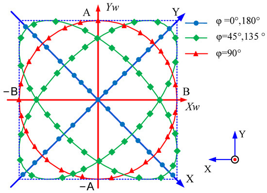 To investigate the influence of different phase differences on the elliptical trajectory output of the D-UEVC device, harmonic response analysis of the D-UEVC device was carried out by finite element analysis. Four sets of excitation signals were established in the two branches of the ultrasonic elliptical vibration system. Each set of signals comprises two identical amplitude sinusoidal signals with varying phase differences, specifically set at 45°, 90°, 135°, and 180°, at a frequency of 36,486 Hz. Vibrational displacement data in the X and Y directions at the tip were computed and obtained at this frequency for the four phase difference sets. Subsequently, the motion trajectory at the end of the actuator was determined using MATLAB R2022a. The specific results are illustrated in Figure 7. When the phase difference between the two signals is 0°, the trajectory approximates a straight line, and the actuator end executes linear reciprocating motion. As the phase difference increases from 0° to 90°, the elliptical shape transitions from flat to full. Furthermore, the minor axis of the ellipse gradually enlarges, while the angle with the Z-axis decreases to 0°. Simultaneously, as the shape of the ellipse evolves, the angle between its major axis and the X-axis decreases progressively towards zero. When the phase difference of the two sinusoidal excitations increases from 90° to 180°, the ellipse gradually flattens, the minor axis diminishes, and the angle with the positive Z-axis increases. Moreover, the angle between the major axis of the ellipse and the positive X-axis also enlarges gradually. Therefore, structural dynamic analysis demonstrates that the D-UEVC device can achieve the desired elliptical trajectory by adjusting the phase difference of the excitation signals.
