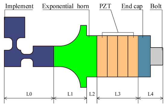 Based on the theoretical analysis presented above, in this study, two sets of longitudinal vibration transducers are arranged at a 90° angle to generate ultrasonic vibrations in the X and Y directions. The longitudinal vibration transducer consists of main components such as the end effector, exponential half-wavelength amplitude horn, PZT, rear cover plate, and preloading bolts (Figure 4). The detailed characteristics of the material are listed in Table 1.