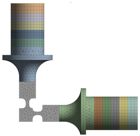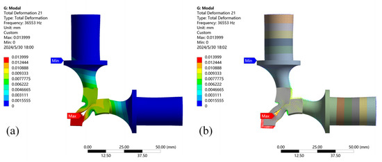 Modal analysis is an essential component of structural dynamics analysis, as it can reveal the resonant frequencies and mode shapes of a structure, thereby providing necessary theoretical support for an in-depth investigation of the dynamic characteristics of the D-UEVC device and subsequent design. Firstly, the three-dimensional model of the device is imported into ANSYS for analysis, with the material properties of each component detailed in Table 1. The flange face is selected as the fixed constraint, and a tied contact method is used for each contact surface. The mesh has a moderate quality, with an element size of 2 mm, a total of 12,444 elements, and 32,393 nodes, as depicted in Figure 5. The results of the modal analysis, shown in Figure 6a,b, indicate that the device’s primary resonant frequency is around 36,553 Hz, at which point the device exhibits axial reciprocating motion.