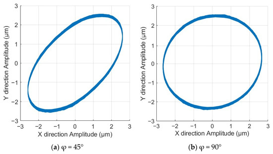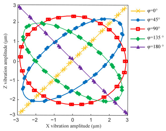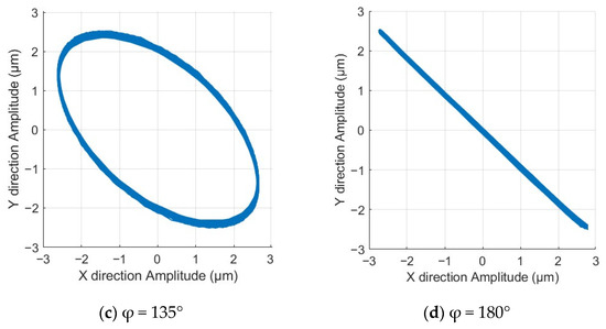 The analysis of the vibration response of the ultrasonic transducer reveals that the phase difference becomes a critical parameter affecting the output elliptical vibration trajectory of the end effector. When the phase difference is 0°or 180°, the vibration trajectory approximates a straight line. For phase differences of 0°–180°, the vibration trajectory forms an ellipse. Figure 3 illustrates the tool tip’s elliptical vibration trajectories formed by different phase differences without considering phase delay errors.