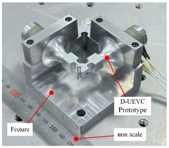 Based on the theoretical and structural dynamic analysis, the prototype of the D-UEVC device was successfully developed in this study, as shown in Figure 8, comprising two one-dimensional vibration transducers arranged at a 90° angle. As the working frequency and elliptical vibration trajectory are crucial parameters determining the processing performance of the UEVC device, an in-depth investigation into the impedance and vibration characteristics of the dual-excitation UEVC device was conducted with the aim of achieving the desired elliptical vibration trajectory in practical applications.