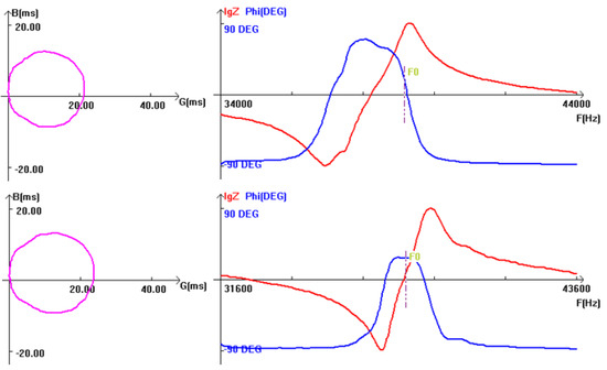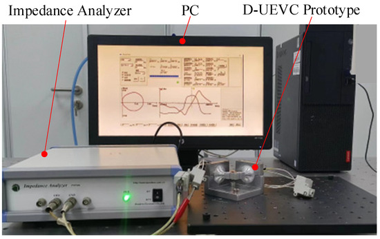 The D-UEVC device presented in this paper was developed based on piezoelectric transducers, which exhibit unique impedance characteristics at different frequencies. Conducting an impedance characteristic test on the device is an effective method to obtain the operating frequency of the device. The PV70A impedance analyzer was used for the experimental test. The impedance analysis parameters were set as follows: the frequency measurement ranges were 34–44 kHz and 31.6–43.6 kHz, respectively, and the calculation step was automatic step. The test results were directly obtained by connecting the impedance analyzer to a computer, as depicted in Figure 9.