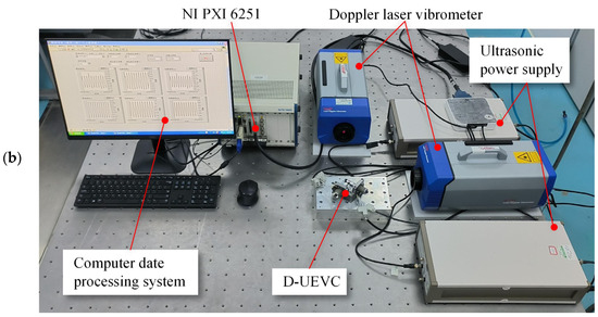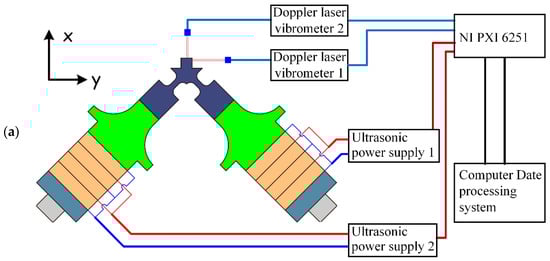 The schematic diagram of the elliptical trajectory testing system is shown in Figure 11a. The excitation signals for both branches are generated by the NI PXI-6251, amplified by the ultrasonic driver (TERK-PZD700A), and applied to the respective branches of the D-UEVC device. Vibration testing is performed by placing two Doppler laser vibrometers (OptoMET VECTOR) at the output end of the effector to measure the axial and radial displacement changes. The testing data are collected and stored through the input interface of the PXI-6251.