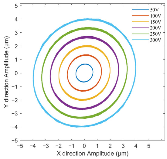 Furthermore, under the condition of a 90° phase difference between the excitation signals of the two sets of ultrasonic drivers and a frequency of 36.5 kHz, elliptical trajectories were tested at different input voltages, as shown in Figure 13. It is observed that when the phase difference is maintained at a constant value, the elliptical trajectory generated at the end increases in size with the increase in voltage. Therefore, by adjusting the phase difference and excitation voltage, different elliptical trajectories can be generated at the output end, enabling precise control over the elliptical trajectory. The experimental results demonstrate that the newly developed D-UEVC device can generate accurate and adjustable elliptical trajectories. Compared to the simulation results, the experimental error is approximately 0.3–0.4 μm, and the measured vibration of the tool tip matches the simulation results, validating the rationality and feasibility of the D-UEVC device design.