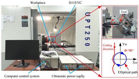 The cutting experiment was conducted to verify the performance of the D-UEVC in machining. As the nickel-based superalloy Inconel 718 is a difficult-to-machine material, traditional machining methods often result in severe tool wear and poor surface quality. Hence, we selected a 30 mm diameter and 50 mm length rod of Inconel 718 as the experimental material. The cutting system depicted in Figure 14 was utilized for the experiment, with the D-UEVC device mounted on the UPT-250 ultra-precision machine tool. The phase difference of the two branches of the device was fixed at 90°, and an elliptical trajectory with the Xw axis perpendicular to the cutting direction was employed for facing milling of Inconel 718. The specific experimental parameters are detailed in Table 3.