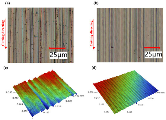 Surface micro-morphology and roughness of different cutting methods: (a,c) CC surface micro-morphology; (b,d) UEVC surface micro-morphology (cutting speed = 4 m/min).