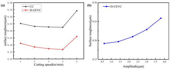 The effect of the cutting parameters on surface roughness: (a) effect of cutting speed on the surface roughness, (b) effect of amplitude on the surface roughness (speed: 5 m/min).