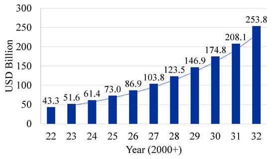 The manufacturing industry has been heavily investing in the development of AI systems for optimizing their production processes. In 2023, the AI market in the manufacturing sector was valued at USD 3.8 billion with an expected Compound Annual Growth Rate (CAGR) of 45%, and it is estimated to reach USD 156.1 billion by 2033 [8]. The demand for predictive maintenance systems is expected to have a rapid revenue rise, already being used across various end-use industries. Various sensors and cameras are placed on the equipment on the production floors to gather data and analyze operational parameters such as temperature, vibrations, and wear of the moving parts. The AI algorithms analyze these data to train the predictive models and provide insights to the manufacturer. These are the driving factors for the increased demand for AI in manufacturing, which is reflected in the increasing revenue trend. The projected growth of AI systems revenue in the manufacturing sector is shown in Figure 1.
