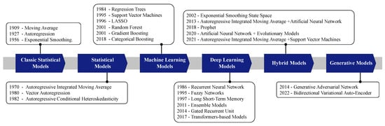 Advancements in the latter 20th century introduced enhanced versions of traditional models, including ARIMA, Vector Autoregression (VAR), and Autoregressive Conditional Heteroskedasticity (ARCH). Among these, the ARIMA model has sustained its prominence within the forecasting domain and is often used with emerging ML and DL techniques. Concurrently, the field of ML, which has roots extending to the late 18th century, became more popular as new variations kept developing in the late 20th century, setting the stage for contemporary applications in time-series forecasting. While DL models are a subset of ML, their complexity and wide variety of specialized architectures, such as Recurrent Neural Network (RNN), Long Short-Term Memory (LSTM), and Gated Recurrent Unit (GRU), justify them being presented as a distinct category. The timeline is shown in Figure 2, and further details are explained in Table 1. These classes have been selected to provide a clear and organized view of the evolution of models in the context of time-series forecasting, including classic statistical models, statistical models, Machine Learning models, Deep Learning models, hybrid models, and generative models. This classification helps us to understand the chronological progression and distinct characteristics of each category.