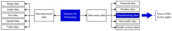 There are various forecasting models available for time-series data, such as image-, audio-, and text-based datasets, as well as for time-series data, including financial, weather, and health systems datasets. Despite the emergence of several recent publications that analyze various ML models for time-series forecasting, a gap exists in the literature regarding a comprehensive analysis of these models, specifically within the context of manufacturing systems, as demonstrated in Figure 3. While these existing papers provide valuable insights into the comparative performance of these models in generic settings or for other types of time-series data, such as sales and finance datasets, they often do not delve into the unique challenges and considerations intrinsic to manufacturing environments, such as constraints on data availability, missing data, features extraction, and model robustness and reliability. Manufacturing systems, with their inherent complexities and multifaceted variables, necessitate a detailed exploration that not only includes models’ predictive accuracy but also encompasses a broader spectrum of factors pivotal for practical implementation. This paper, therefore, seeks to bridge this gap by undertaking a comprehensive analysis of time-series forecasting models in manufacturing systems. It aims to navigate the challenges posed by manufacturing data and operational contexts, thereby providing a holistic evaluation that aligns more closely with the real-world applicability and efficacy of these forecasting models in manufacturing scenarios and that presents their advantages and challenges. The objectives of this review paper are: