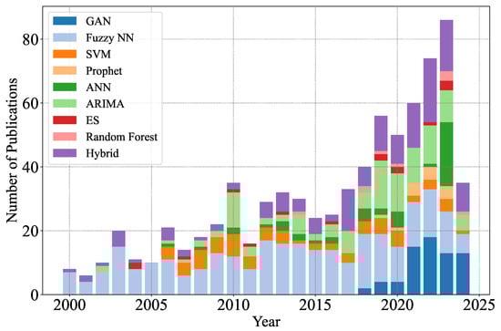The number of papers published in the domain of time-series forecasting (2000–2024). Please note that the information for the year 2024 is limited to the time of publication of this paper.
