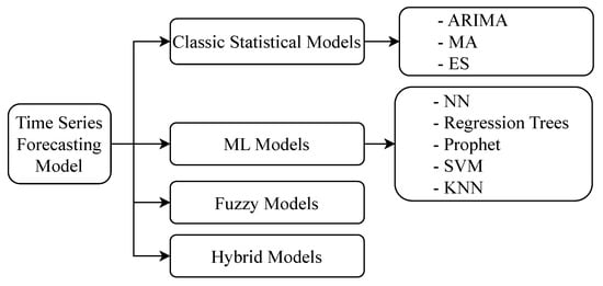 In this paper, we discuss nine of the time-series forecasting models, including ANN, ARIMA, MA and ES, regression trees, Prophet, k-Nearest Neighbors (KNN), SVM, Fuzzy models, and some hybrid models. Their wider categories are shown in Figure 6.