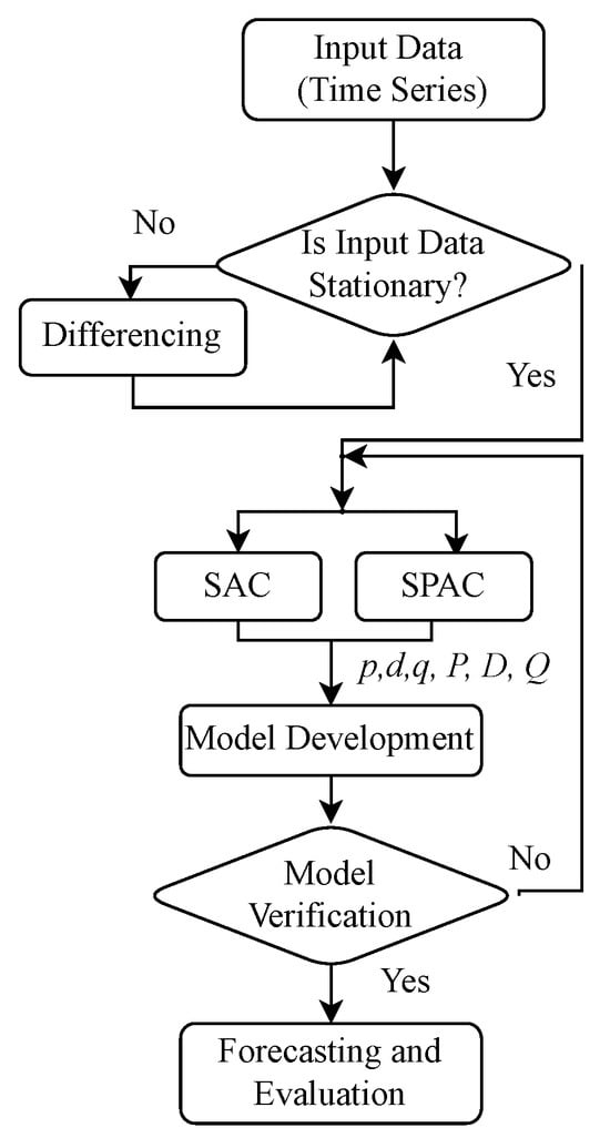 The ARIMA model is a well established and conventional technique for time-series forecasting, particularly for univariate data [24,35,144,153]. ARIMA models rely on a combination of three components: (i) AR, (ii) differencing (I), and (iii) MA to capture the underlying patterns and dependencies within a given time-series [143,154]. The AR function represents the dependence of a data point on its previous observations (lags), taking into account the time lag and coefficients. The MA component models the error terms by considering the dependency on previous error terms and their respective coefficients [26,155,156]. Finally, the I component refers to the differencing applied to the dataset to ensure stationarity by excluding trends and seasonality. Figure 7 presents an overall flow of ARIMA, including with Sample Autocorrelation (SAC) and Sample Partial Autocorrelation (SPAC). ARIMA models are represented by the notation ARIMA , where p is the parameter for AR order, d is the degree of differencing for the I function, and q is the order of the MA component [143,144]. The appropriate values for p, d, and q are typically evaluated using Information Criterion (AICAkaike) or the Bayesian Information Criterion (BIC) for model selection [157,158,159,160].