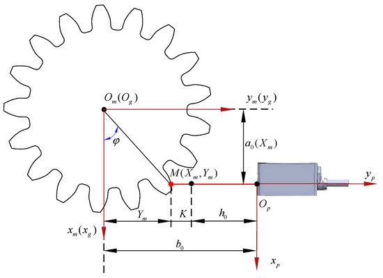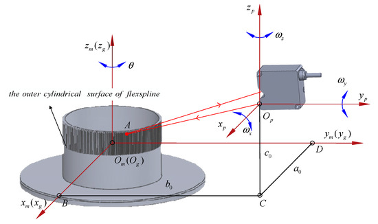 The sensor emits light on a point of a tooth flank of the flexspline, and this point is called the measured point. The offset distances of the sensor along the tangential, radial, and axial directions of the flexspline are , , and , respectively. The mathematical expression for the spatial coordinates of the measured point in the gear coordinate system is as follows:
