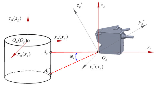In the experiment, the sensor’s poses were first calibrated according to the process in Section 2.2 of this paper. After calibration, the pitch, rolling, and yaw angles were considered to be adjusted in place, and solved for the offset distances as follows: = 11.044 mm, = 38.869 mm, and set = 0 mm.