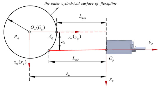 - Calibration of pitch angle . As shown in Figure 2, the sensor measuring point needs to be adjusted to . To accomplish this, the pitch angle of the PLS needs to be fine-tuned so that the emitted light from the sensor shines on the outer cylindrical of the flexspline and remains within the effective range of the sensor. Next, a set of measurements on the outer cylindrical of the flexspline must be obtained. Finally, the turning point in the measurements needs to be found; this is where the values change from large to small and then back to large and stop at the minimum value . At this point, the sensor’s pose around the axis has been adjusted to the calibrated zero position.