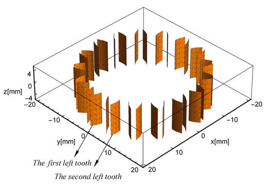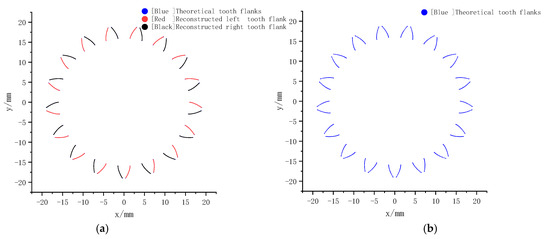 Taking , a number of sample points of the left tooth flank can be obtained. Using these sampling points, the reconstructed left tooth flank can be obtained from the tooth flank reconstruction principle in Section 2.3. Similarly, the reconstructed right tooth flank can be obtained.