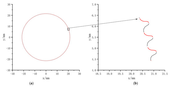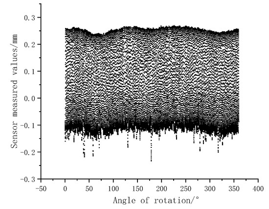 During the measurement process, the spindle rotates and the laser light emitted by the PLS scans the teeth flanks of the gear, obtaining the angular position of the tested gear and the measurement value of the sensor. At a specific cross-section of the flexspline, because the PLS is positioned at a particular offset distance in the tangential direction, it can only capture valid point data from one side of the measured flexspline’s teeth flanks for each rotation of the spindle. Consequently, to acquire information about both the left and right teeth flanks of the flexspline, the PLS must be moved to a new offset distance after obtaining the profile information of the teeth flanks at the offset distance . Through this process, information about both the left and right teeth flanks of the flexspline in a particular cross-section can be obtained.