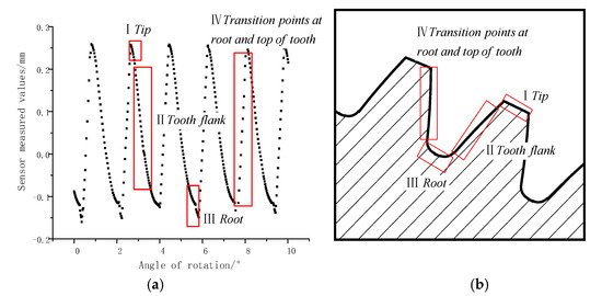 As shown in Figure 11, under the offset condition, as the gear rotates, the sampled points from the sensor may fall into one of four regions. The measurement data is invalid when the sampling point is in zone IV (where the measuring light of the PLS is obscured). In addition, the actual measurement light ray has a certain diameter (about 0.025 mm), which can lead to a transition state in the measurement distance when part of the light hits the gear’s root and the other part hits the gear’s tip, resulting in invalid points.