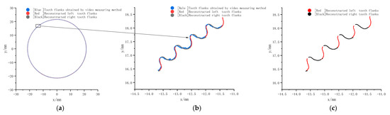 Comparison of reconstruction of teeth flank data with teeth flank data obtained by video measuring method. (a) Overall comparison of video measuring method with reconstructed teeth flanks. (b) Partial comparison of the video measuring method with the reconstructed teeth flanks. (c) Partially reconstructed teeth flanks.