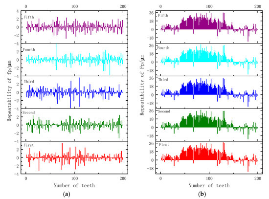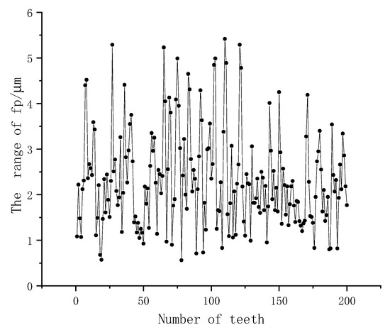 In this experiment, the tooth pitch deviation is evaluated using the tooth profile of the left flank of the flexspline. The results of five measurements of single pitch deviation [3] and total cumulative pitch deviation [3] of the left teeth flanks are shown in Figure 14. The single pitch deviation is 34.57 µm and the total cumulative pitch deviation is 63.69 µm (shown in Table 3). As shown in Figure 15, the repeatability of single pitch deviation or cumulative pitch deviation measurements is within ±3 µm. The pitch deviation results obtained by the proposed method show good repeatability, indicating that the measurement method has good stability and reliability and can reflect the true state of the flexspline teeth flanks. It should be noted that after the sensor has been fully warmed up, when measuring stationary objects at vertical incidence, the measured data jumps by about ±0.625 µm, which is one of the sources of repeatability errors in the measured data.