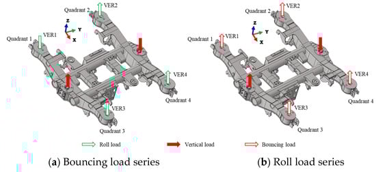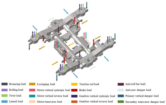 During the operations of a high-speed EMU, the loading state of the bogie frame is complex, and the bogie frame simultaneously bears and transmits a variety of loads from the car body, wheelset and its own installation components, among which there is a strong coupling relationship []. Taking the power bogie frame with a more complicated loading state as an example, the loads acting on the bogie frame can be divided into 16 load series according to the vehicle motion characteristics, the actual bearing condition of the structure and the systematisms of the load identification of complex structures [], as shown in Figure 1.