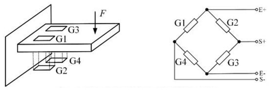 Under the vertical load and transverse load, the frame structure displays bending deformation. As shown in Figure 3, four strain gauges G1~G4 of the same specifications are symmetrically arranged on the two surfaces of the cantilever beam, corresponding to the resistance values R1 = R2 = R3 = R4, and strain gauge sensitivity coefficients are all K0 to form a full-bridge circuit.