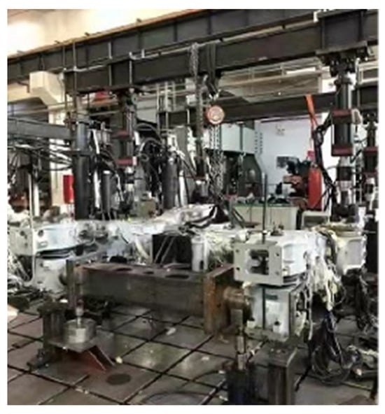 Figure 4 shows the bogie frame static calibration test site. By simulating the load state of the bogie frame in service, the corresponding relationship between the load and the bridge output for the load identification is obtained, that is, the load channel coefficient. At the same time, according to the action mode and position of each load series on the bogie frame, the load–stress response relationship between a single load series and all the fatigue key parts was also obtained on the hydraulic test bench, which is the key basis for the fatigue evaluation of the bogie frame based on the measured load. The detailed static calibration of the bogie frame can be found in [].