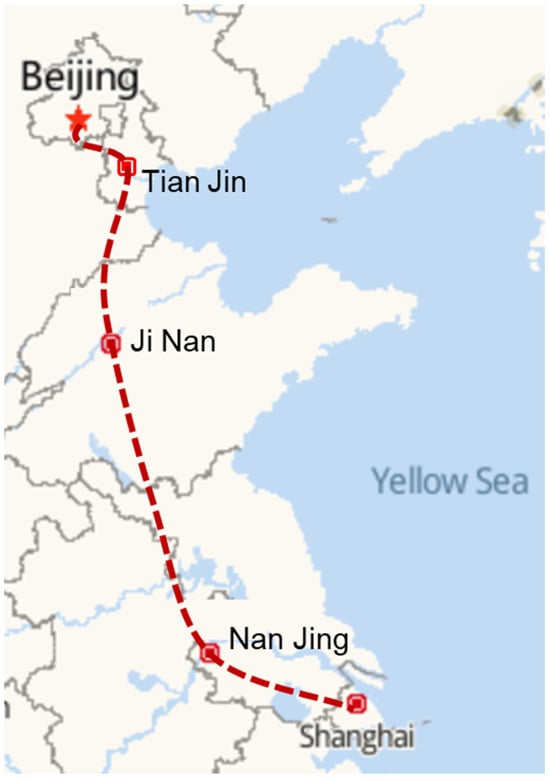 After the static calibration, the load measuring frame was installed on the CR400AF high-speed EMU for line testing. The test route was the Beijing–Shanghai high-speed railway, as shown in Figure 5. The test speed was 200 km/h, 250 km/h, 300 km/h, 350 km/h and 400 km/h. To identify various typical operating conditions of the high-speed EMU, not only the strain response of the bogie frame identification point but also the running state information of the vehicles, including the GPS signal and gyroscope signal, were collected at the track test. The GPS signal contains the vehicle running speed and position information, and the gyro signal is used to determine the vehicle motion attitude. The SoMat eDAQ data acquisition system was used to realize the synchronous and uninterrupted acquisition of the GPS signal, gyroscope signal and strain signal, and the sampling frequency was 50 Hz, 50 Hz and 2 kHz, respectively. During the track test, all the data of the test train were collected completely, covering the typical operating conditions, such as a straight line, curve, acceleration, deceleration, etc., to ensure the integrity of the test data.