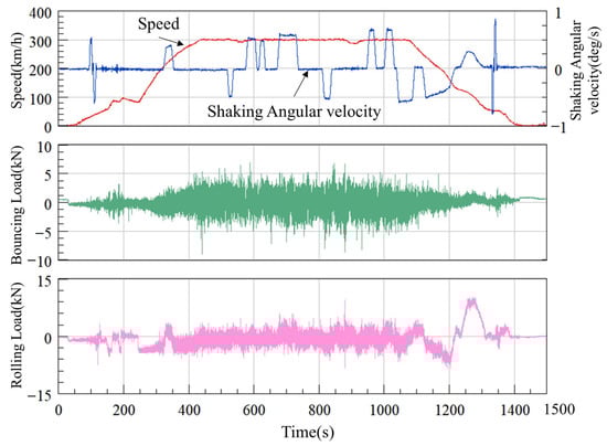 The measured data are used for data analysis after a series of pre-processing processes []. Figure 6 shows the speed, shaking angular velocity, bouncing load, and rolling load between the two stations with a speed class of 300 km/h. Among them, the shaking angular velocity is used to reflect the line condition. When the vehicle runs in a straight line, the shaking angular velocity signal fluctuates near the zero line. When the vehicle passes through the curve, the amplitude of the shaking angular velocity signal increases, and its value and duration are related to the radius and length of the curve, respectively. The positive value represents the fact that the vehicle body deflects to the right side of the traveling direction, and vice versa.