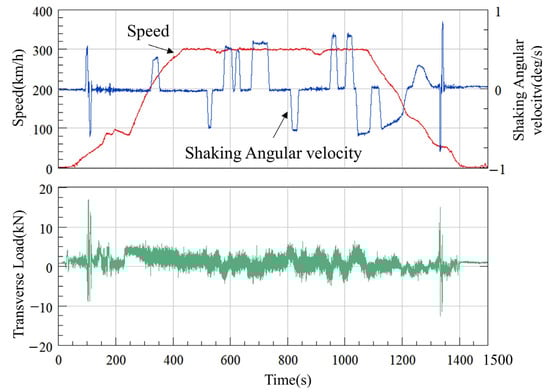 Figure 7 shows the speed, shaking angular velocity and transverse load–time history between the above two stations. Under the acceleration and deceleration conditions, the transverse load in the switch area (around 100 s and 1350 s) changes significantly, with the maximum and minimum values of 17.0 kN and −12.6 kN, respectively. Under the condition of constant speed, the overall amplitude of the transverse load is small, and the trend term appears in the curve section.