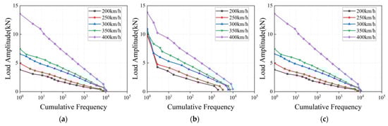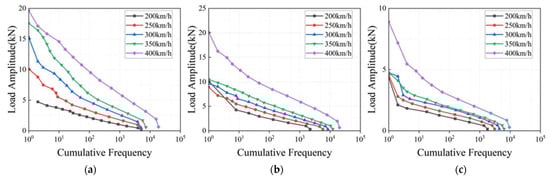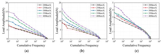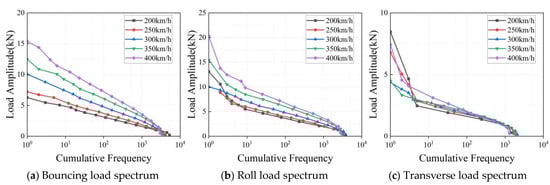 For the bouncing load spectrum and roll load spectrum, the larger the velocity stage in the low cumulative frequency range, the larger the load amplitude. For the transverse load, the load amplitude is the smallest at 200 km/h, the same at 300 km/h and 350 km/h, and the largest at 400 km/h.