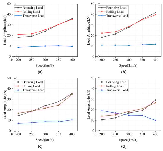 Figure 12 shows the equivalent load amplitudes of the bogie frame loads under different operating conditions for five typical speed classes. It can be seen that the equivalent load amplitudes of the bouncing load and rolling load increase significantly with the increase in the speed classes under four operation conditions, and the equivalent load amplitude of the transverse load changes are relatively small except for the deceleration condition.