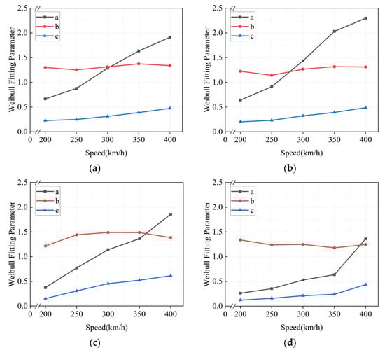 Relationship of the Weibull fitting parameters and speed of the bouncing load spectrum. (a) Constant speed operation on a straight line. (b) Constant speed operation on a curved line. (c) Acceleration operation. (d) Deceleration operation.