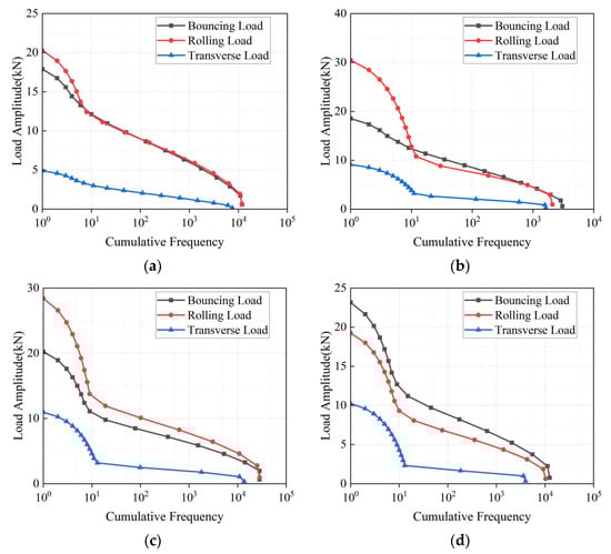 Cumulative load spectrum at a 450 km/h speed. (a) Constant speed operation on a straight line. (b) Constant speed operation on a curved line. (c) Acceleration operation. (d) Deceleration operation.