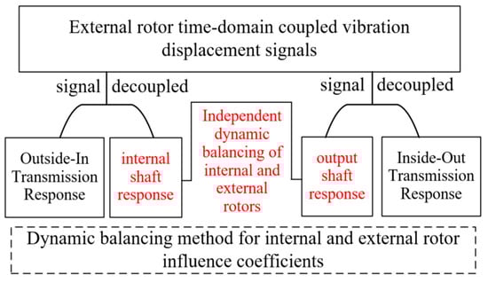 - Based on the independently designed and constructed simulated dual-rotor test bench, dynamic balancing tests with coaxial counter-rotating dual-plane dual influence coefficients were carried out. Beneficial vibration reduction effects were achieved for both the inner and outer rotors under three typical working conditions, further proving the accuracy of the identification algorithm, which meets the requirements for dynamic balancing accuracy of the equipment and stable operation.