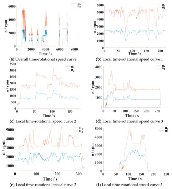 In Figure 3, the abscissa time is 8000 s. After a comprehensive analysis of the two figures, it can be concluded that the change rule of the engine is basically similar. As shown in Figure 3a, the representative of the five sections is selected, covering the engine rotational speed amplitude and frequency changes; it is enlarged to draw. In Figure 3b, it takes 6 s for the engine to go from the speed of 2400 rpm to the maximum speed of 1060 rpm, with a speed change of about 1340 rpm. In Figure 3c, it is concluded that the engine takes 4 s from 746 rpm to 1300 rpm, and the speed changes at about 554 rpm. Engine rotational speed went from 1100 rpm to 840 rpm in 2 s, a speed change of about 260 rpm. From Figure 3d, it is concluded that the engine changes from 1600 rpm to 700 rpm in 5 s, and the speed changes to about 900 rpm. Engine rotational speed changes from 1250 rpm to 900 rpm in 1 s, a speed change of about 350 rpm. Engine rotational speed changes from 839 rpm to 759 rpm in 2 s, a speed change of about 80 rpm. From Figure 3e, the engine changes from 2436 rpm to 1315 rpm in 8 s, and the speed changes about 1121 rpm. Engine rotational speed changes from 2424 rpm to 1723 rpm in 7 s, a speed change of about 700 rpm. From Figure 3f, it is concluded that the engine takes 3 s from 0 rpm to 950 rpm, and the speed changes about 950 rpm. Engine rotational speed changes from 1937 rpm to 0 rpm, which takes 16 s, with a speed change of about 1900 rpm.