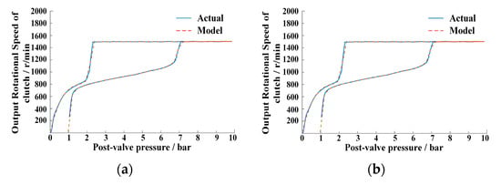 In Figure 8, the maximum error of the model is 160 r/min, the average error is 15 r/min, the error percentage is 9.8%, and the model can represent the hysteresis characteristics of the system. The data-driven model of the Kalman filter, data classification, and neural network can describe the nonlinear characteristics of hydro-viscous clutch well and avoid parameter uncertainty in the process of mechanism modeling.