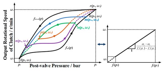 In Figure 9, assuming that the ascending and descending curves are replaced by two nonlinear functions fup(p) and fdown(p), respectively. The ascend or descend of the inverse hysteresis model reference function fr(p) is associated with the rotational speed ω. The linear formula in Figure 9 can be expressed as the following: