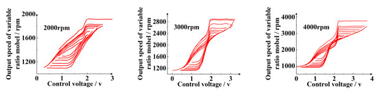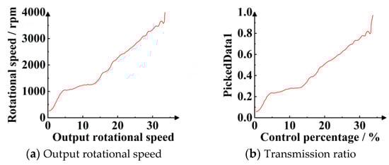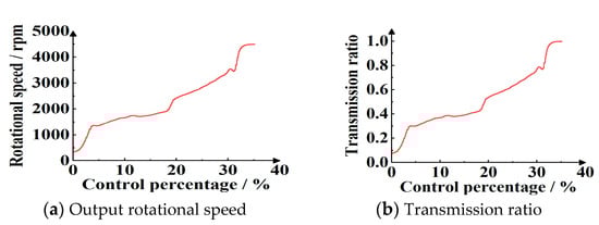 From the simulating curve in Figure 30, it can be calculated that the maximum stable rotational speed is 3688 r/min when the corresponding transmission ratio is 0.82, and the minimum stable rotational speed is 345 r/min when the corresponding transmission ratio is 0.07.
